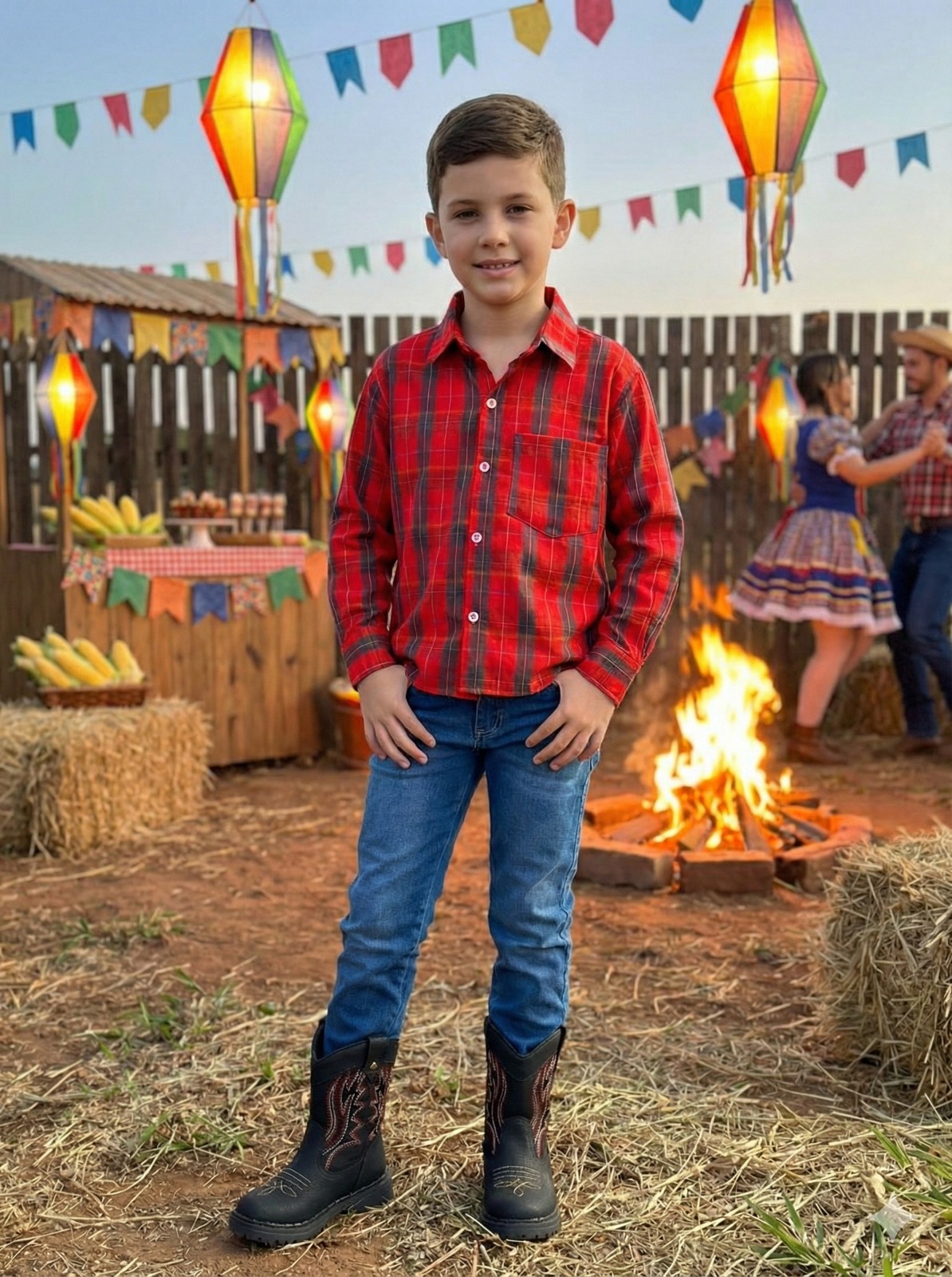 Clássica, confortável e indispensável para as festas mais animadas do ano. Essa camisa xadrez é perfeita para compor looks juninos e julinos cheios de charme, sem abrir mão do conforto que criança precisa.