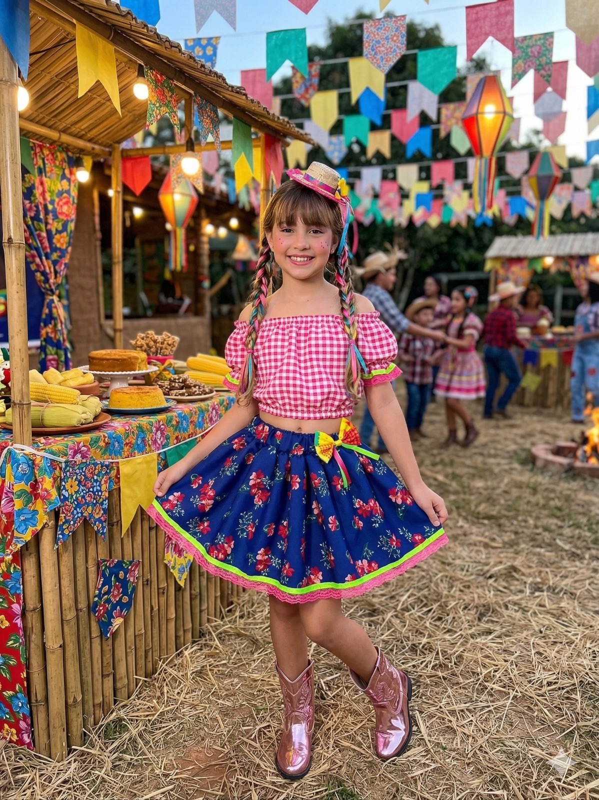 Confeccionado em tecido misto possui forro em poliéster e algodão para não incomodar a criança e proporcionando um caimento incrível e sofisticado, possui gola redonda, comprimento médio, mangas curtas, possui elástico na cintura para melhor ajuste e blusinha com elástico nas costas para ajustar a parte posterior do conjunto completando o look dos sonhos!