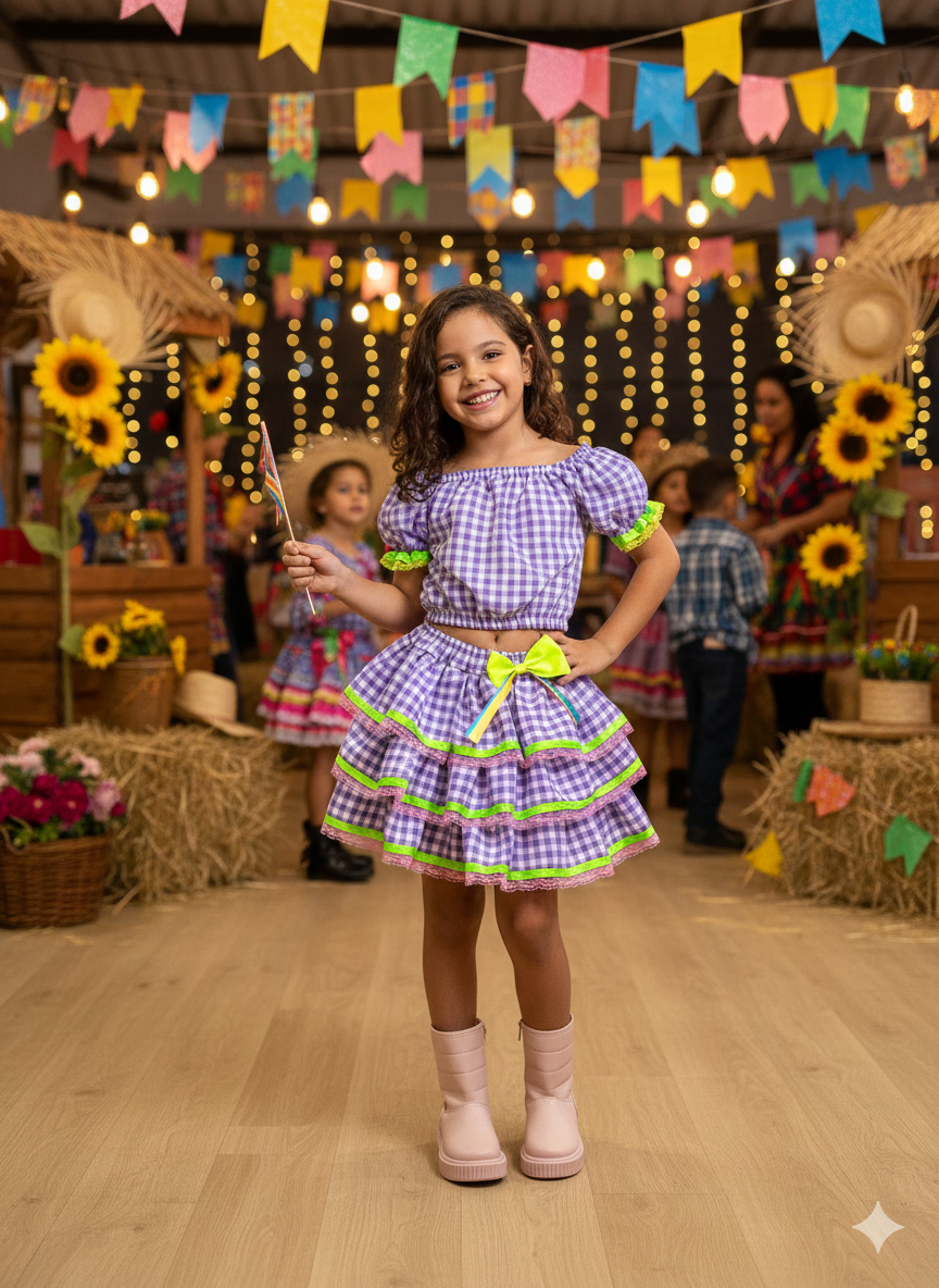 Confeccionado em tecido misto possui forro em poliéster e algodão para não incomodar a criança e proporcionando um caimento incrível e sofisticado, possui gola redonda, comprimento médio, mangas curtas, possui elástico na cintura para melhor ajuste e blusinha com elástico nas costas para ajustar a parte posterior do conjunto completando o look dos sonhos!