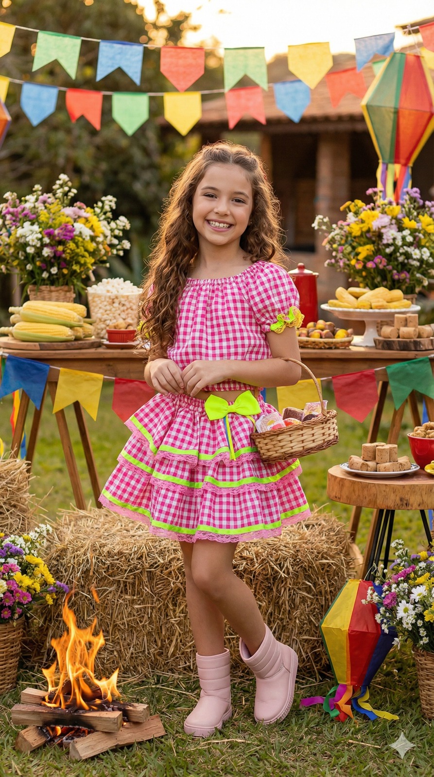 Conjunto Junino Banana Club Luxo Sofia Xadrez Rosa