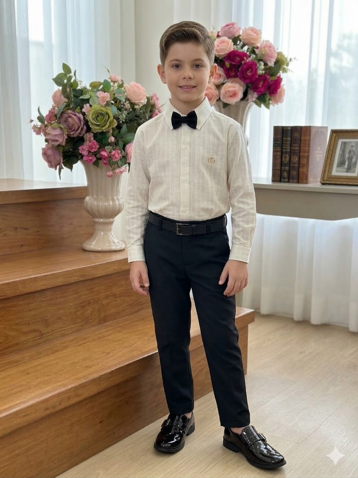 Um conjunto sofisticado e moderno, perfeito para ocasiões especiais. A combinação da camisa com a calça social cria um visual elegante, ideal para deixar os pequenos ainda mais estilosos em eventos importantes.