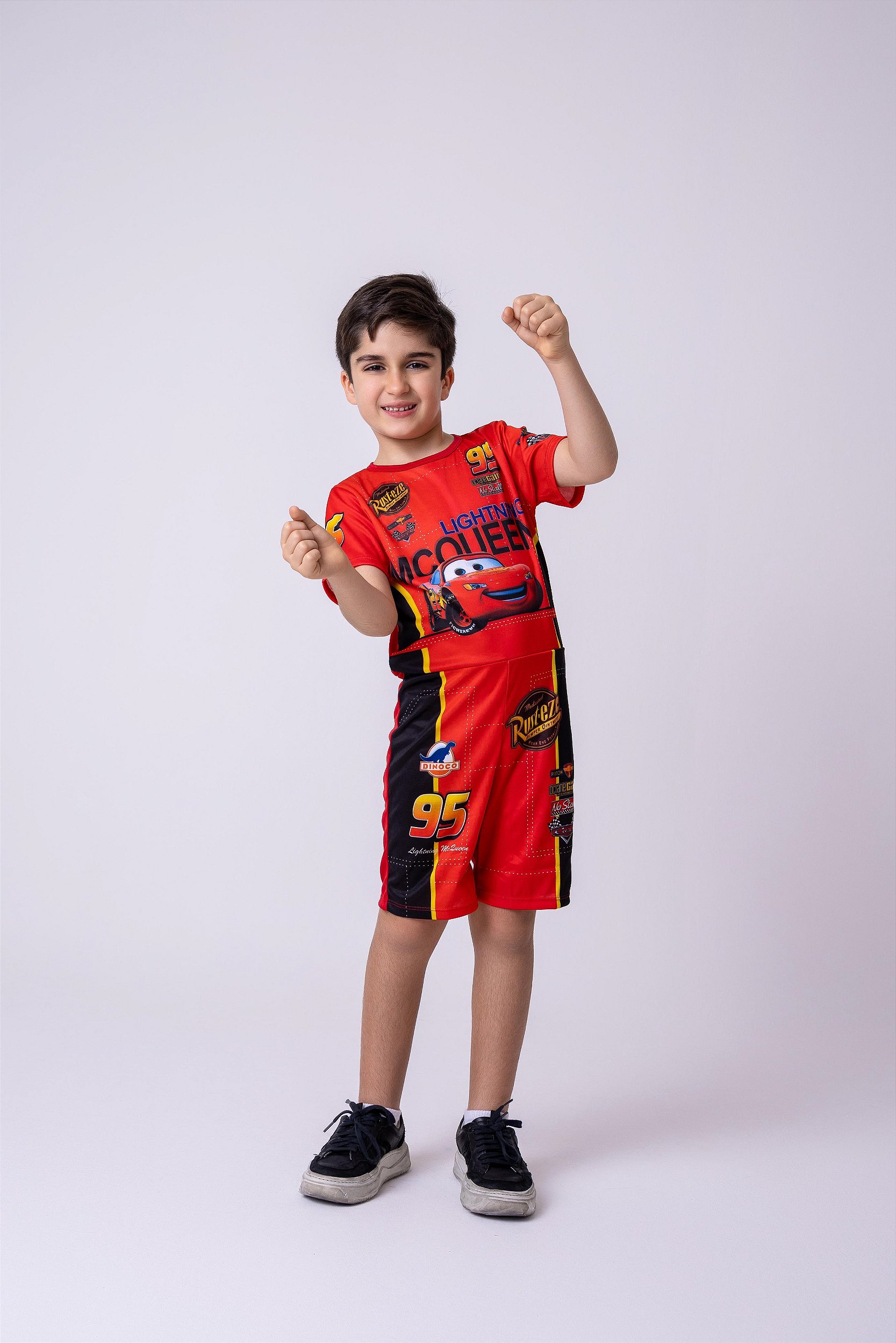 Destaque para o personagem Lightning McQueen (Relâmpago McQueen) estampado na frente com o sorriso marcante.