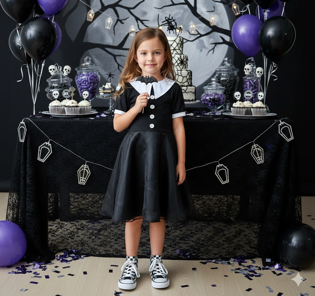 Transforme sua pequena em uma verdadeira integrante da Família Addams com a Fantasia Wandinha! Inspirada na icônica personagem, essa fantasia traz um visual sombrio e elegante, perfeito para festas temáticas, Halloween, ou momentos de pura diversão.