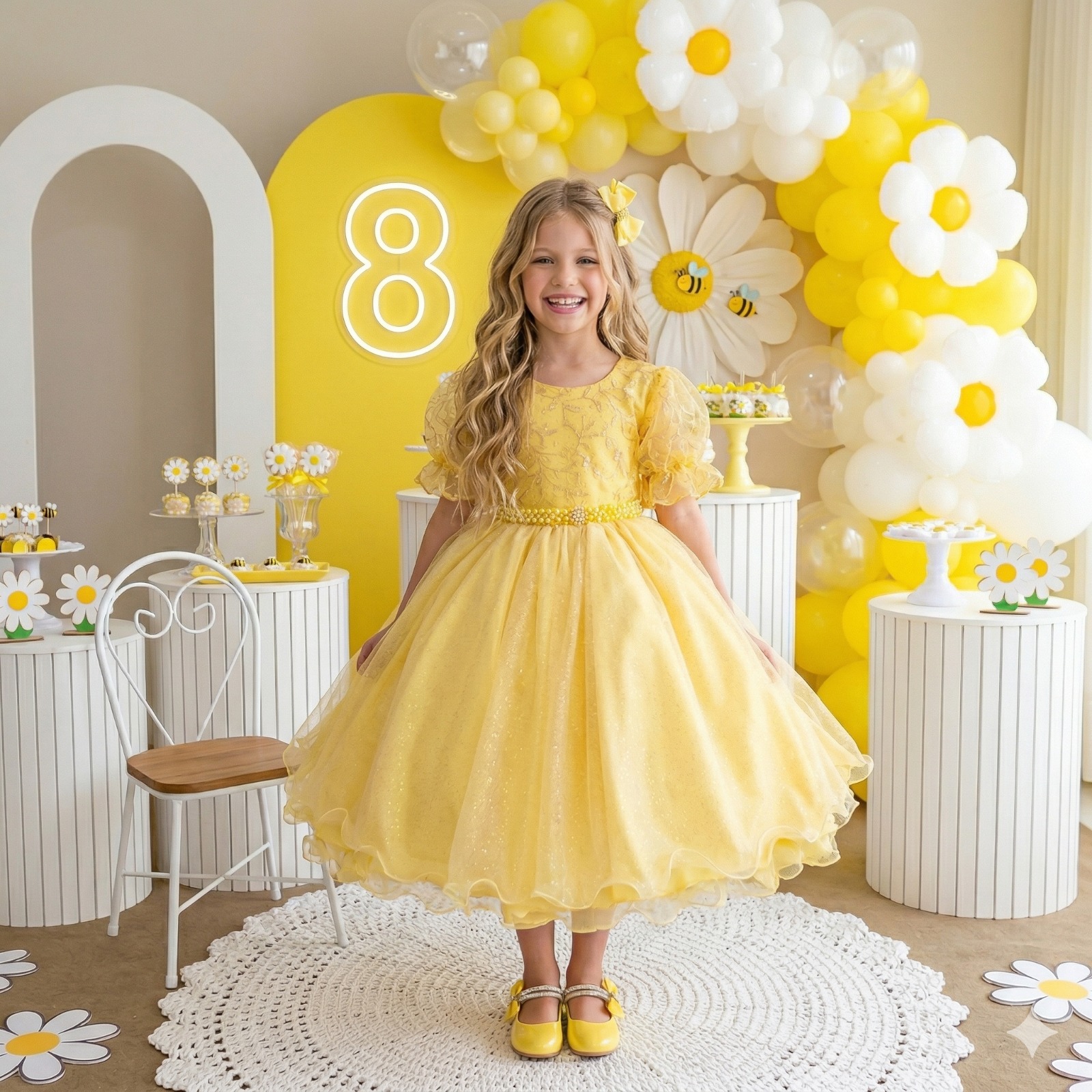 Confeccionado em tecido misto possui forro em poliéster e algodão para não incomodar a criança e proporcionando um caimento incrível e sofisticado, possui gola redonda, comprimento médio, mangas curtas, possui elástico nas costas para melhor ajuste, acabamento com lindo laço na parte posterior do vestido completa o look dos sonhos!