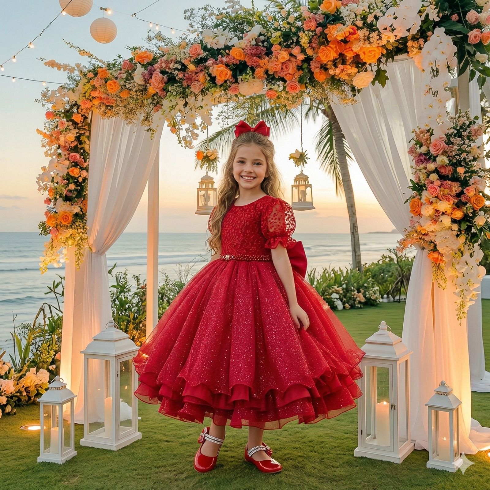 Confeccionado em tecido misto possui forro em poliéster e algodão para não incomodar a criança e proporcionando um caimento incrível e sofisticado, possui gola redonda, comprimento médio, mangas curtas, possui elástico nas costas para melhor ajuste, acabamento com lindo laço na parte posterior do vestido completa o look dos sonhos!