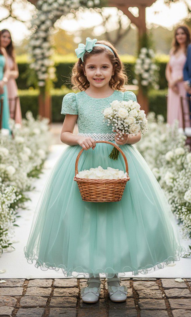Esse vestido infantil longo é pura delicadeza e sofisticação. O corpete em renda delicada traz um toque romântico e clássico, enquanto a saia volumosa em camadas de tule suave garante movimento encantador, digno de princesa. A cintura é realçada por um cinto feito de pérolas, que adiciona elegância e um brilho especial ao visual.