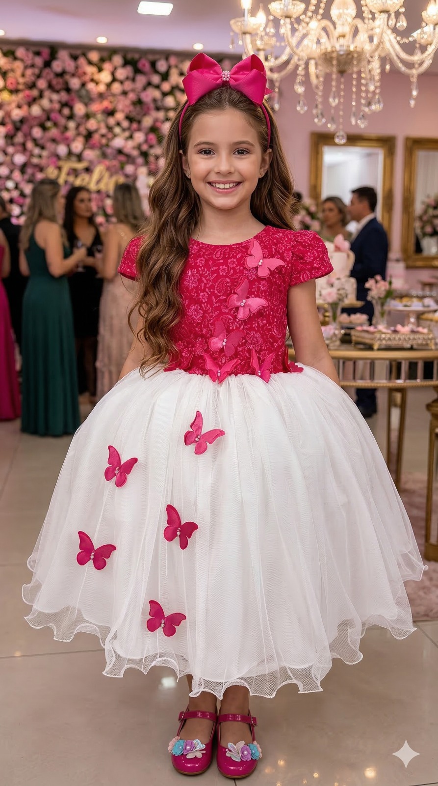 O modelo possui corpete estruturado com bordados florais e aplicações de borboletas 3D com detalhes em strass e pérolas, que trazem movimento e sofisticação. A saia em camadas de tule com acabamento ondulado cria um caimento leve e volumoso, digno de uma princesa.