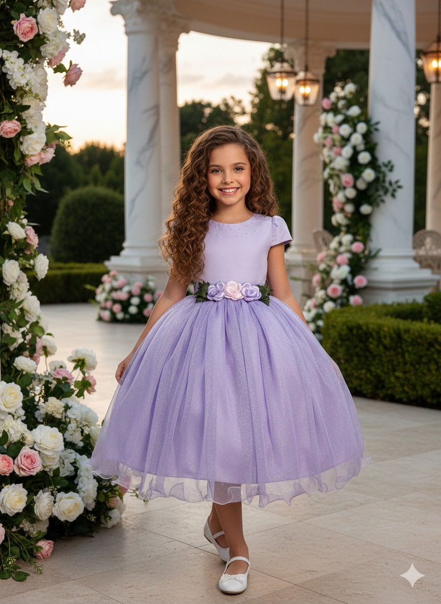 Confeccionado em tecido misto possui forro em poliéster e algodão para não incomodar a criança e proporcionando um caimento incrível e sofisticado, possui gola redonda, comprimento médio, mangas curtas, possui elástico nas costas para melhor ajuste, acabamento com lindo laço na parte posterior do vestido completa o look dos sonhos!