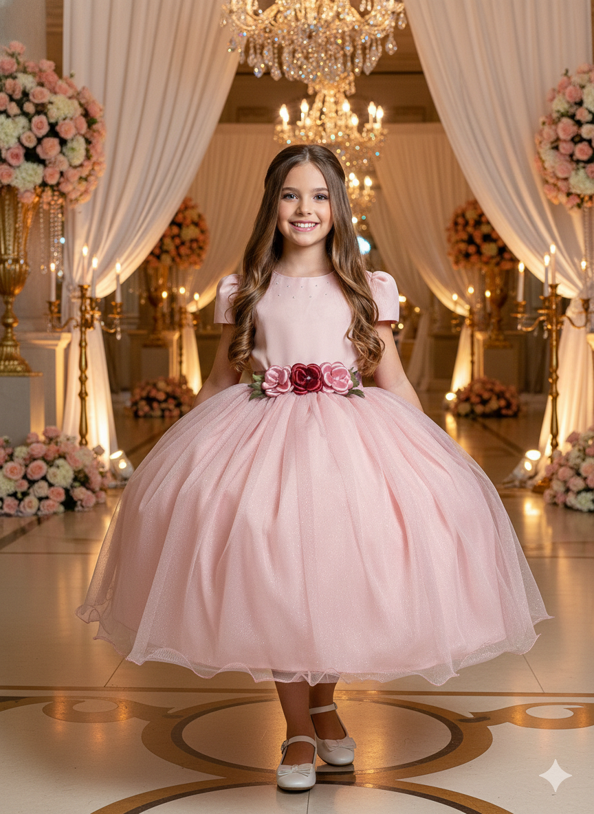 Confeccionado em tecido misto possui forro em poliéster e algodão para não incomodar a criança e proporcionando um caimento incrível e sofisticado, possui gola redonda, comprimento médio, mangas curtas, possui elástico nas costas para melhor ajuste, acabamento com lindo laço na parte posterior do vestido completa o look dos sonhos!