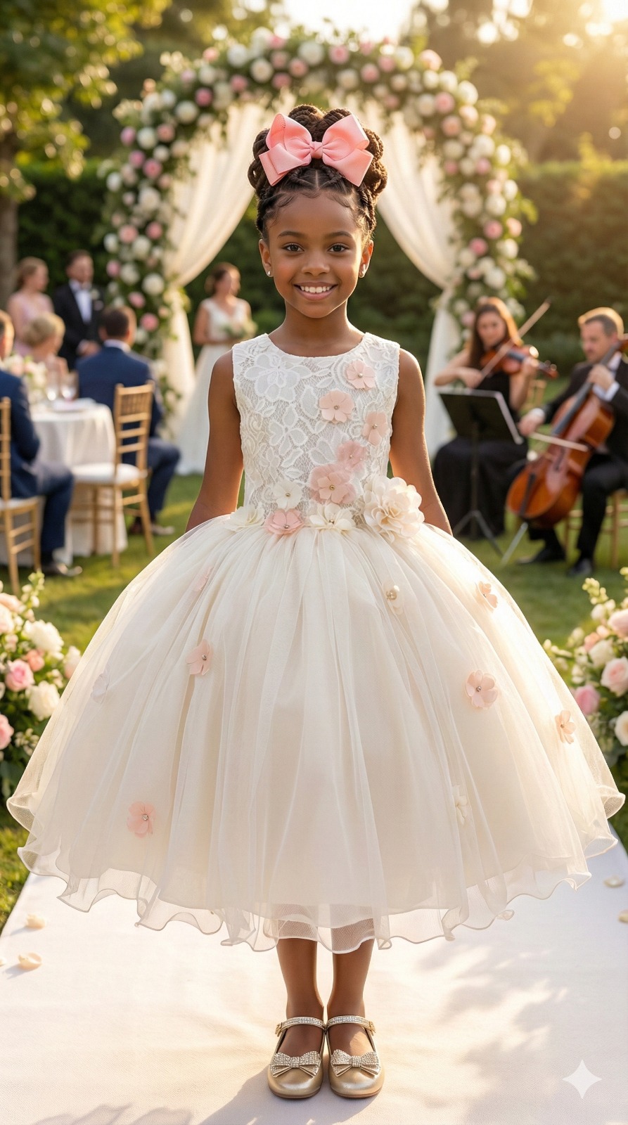 Confeccionado em tecido misto possui forro em poliéster e algodão para não incomodar a criança e proporcionando um caimento incrível e sofisticado, possui gola redonda, comprimento médio, mangas curtas, possui elástico nas costas para melhor ajuste, acabamento com lindo laço na parte posterior do vestido completa o look dos sonhos!