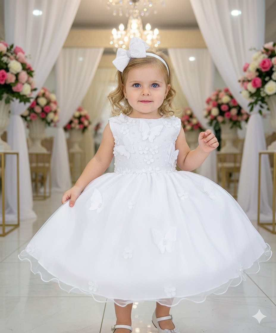 Confeccionado em tecido misto possui forro em poliéster e algodão para não incomodar a criança e proporcionando um caimento incrível e sofisticado, possui gola redonda, comprimento médio, mangas curtas, possui elástico nas costas para melhor ajuste, acabamento com lindo laço na parte posterior do vestido completa o look dos sonhos!