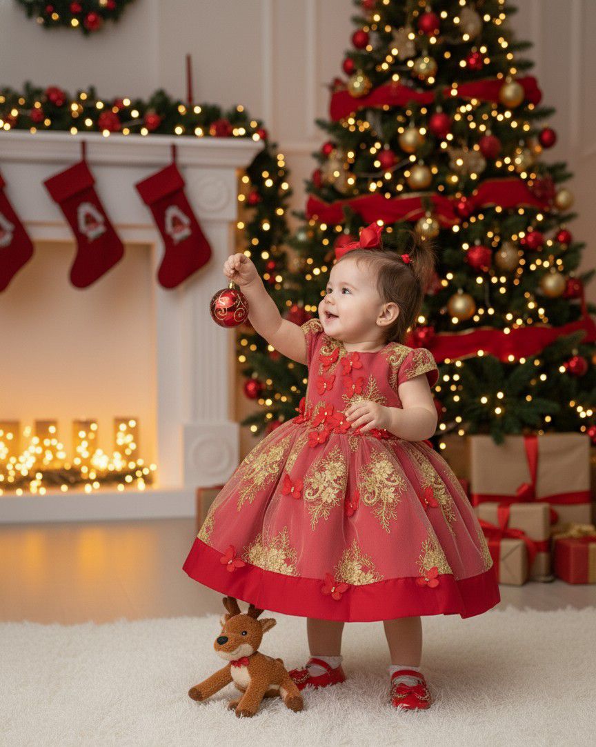 Inspirado na delicadeza das princesas, o modelo vem em um tom vermelho delicado, com bordados florais em relevo, apliques 3D com pérolas e lindo laço nas costas — um charme em cada detalhe!