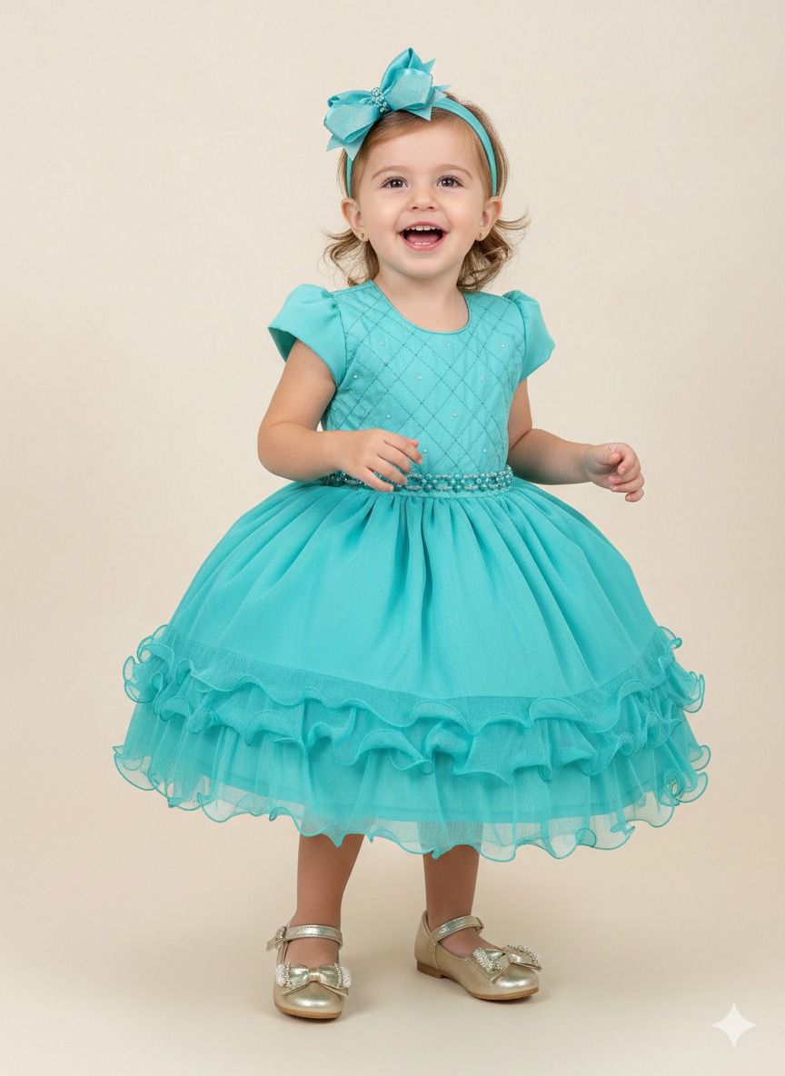 Confeccionado em tecido misto possui forro em poliéster e algodão para não incomodar a criança e proporcionando um caimento incrível e sofisticado, possui gola redonda,comprimento médio, mangas curtas, possui elástico nas costas para melhor ajuste, acabamento com lindo laço na parte posterior do vestido completa o look dos sonhos!