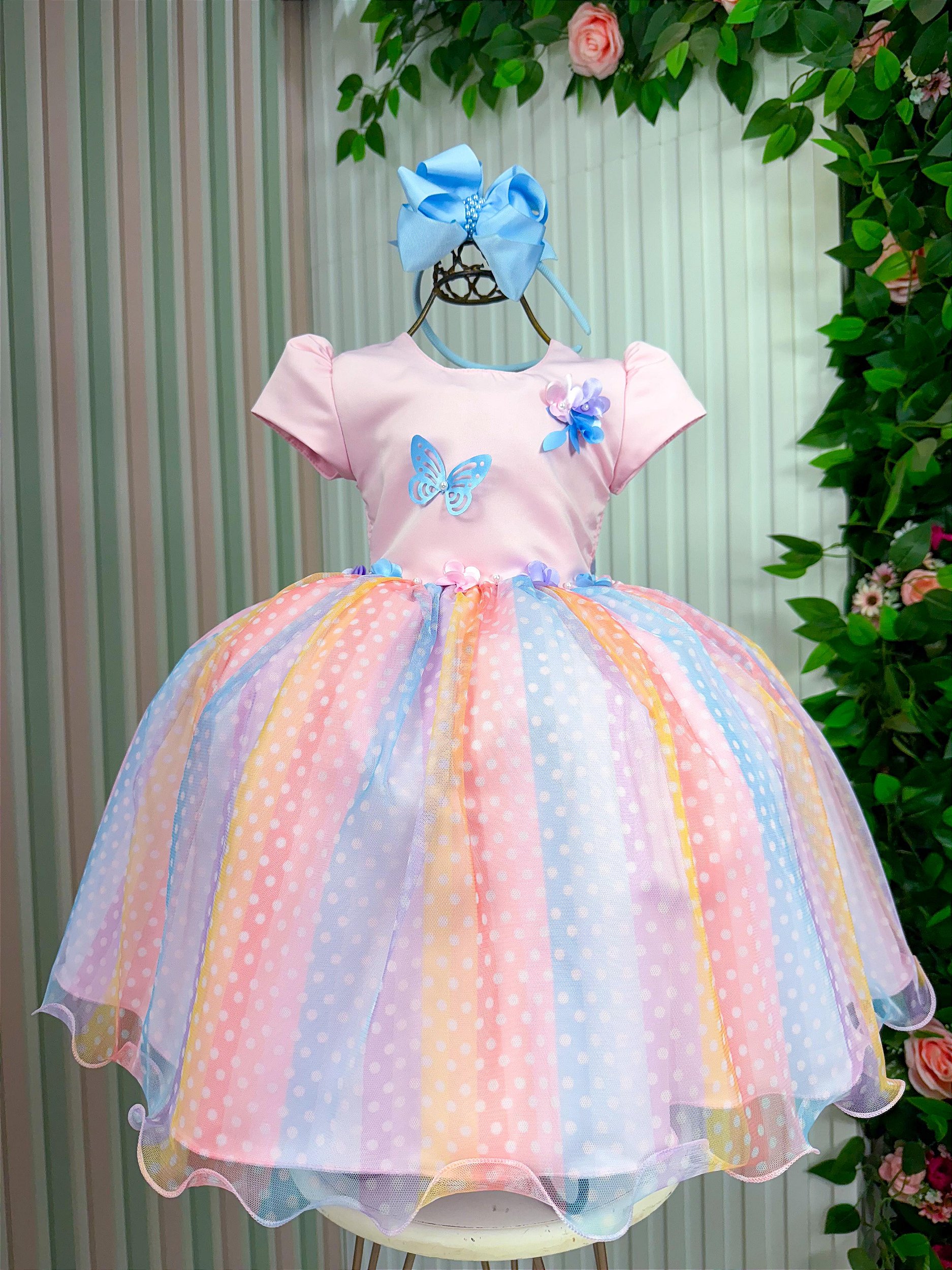 Confeccionado em tecido misto possui forro em poliéster e algodão para não incomodar a criança e proporcionando um caimento incrível e sofisticado, possui gola redonda,comprimento médio, mangas curtas, possui elástico nas costas para melhor ajuste, acabamento com lindo laço na parte posterior do vestido completa o look dos sonhos!