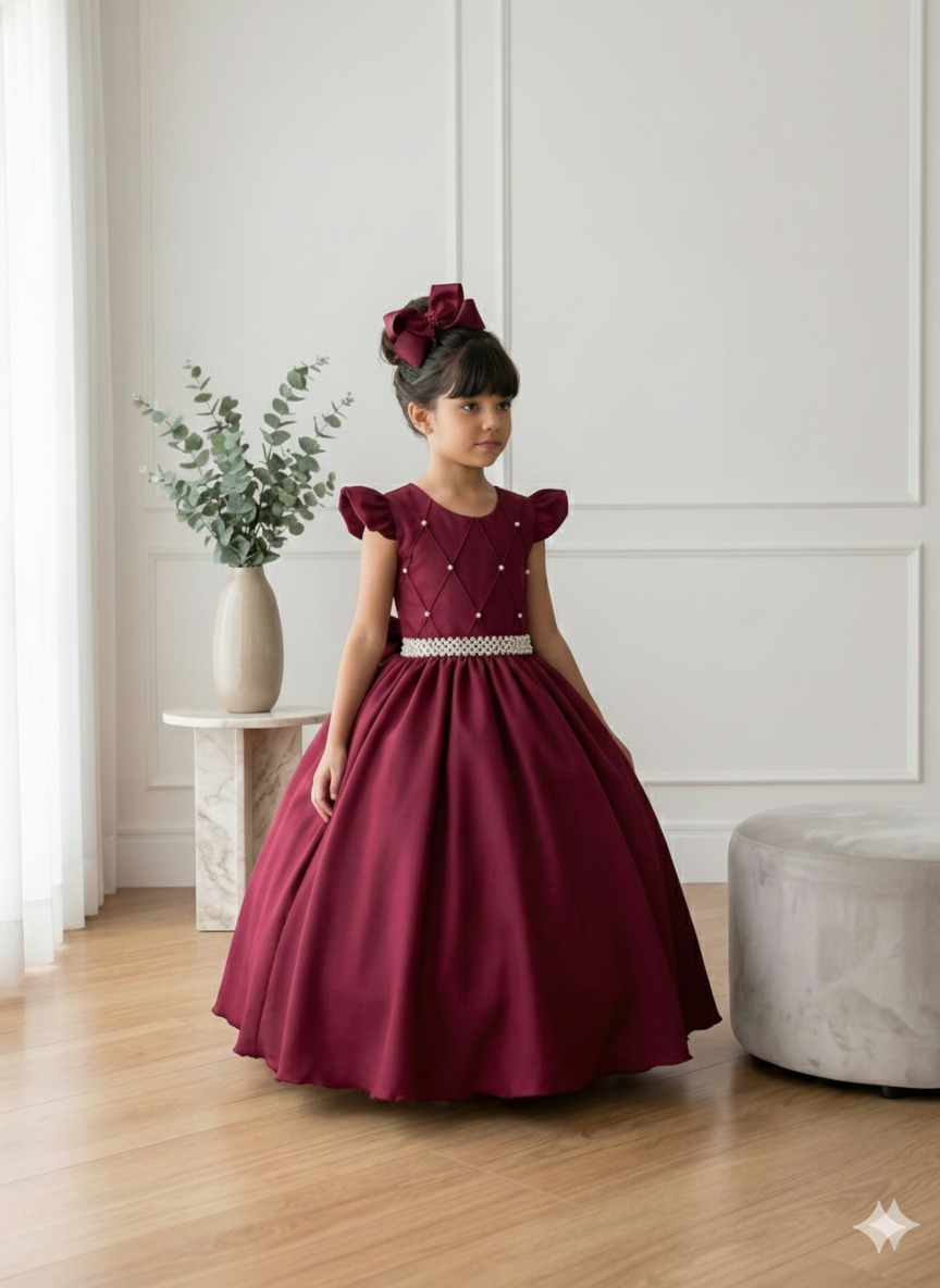 Confeccionado em tecido misto possui forro em poliéster e algodão para não incomodar a criança e proporcionando um caimento incrível e sofisticado, possui gola redonda, comprimento médio, mangas curtas,  contém, também, elástico nas costas para melhor ajuste, acabamento com lindo laço na parte posterior do vestido completa o look dos sonhos!